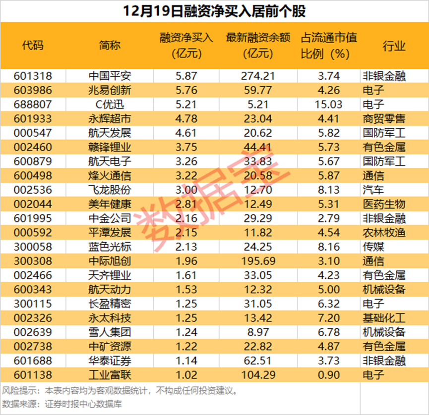 人民财讯12月22日电,截至12月19日富盈策略,市场融资余额合计2.49万亿元,较前一交易日增加45.77亿元。具体到个股,22只股融资净买入额超亿元。中国平安融资净买入额居首,当日获净买入5.87亿元,其次是兆易创新、C优迅,获融资净买入金额分别为5.76亿元、5.21亿元,融资净买入金额居前的还有永辉超市、航天发展、赣锋锂业等。